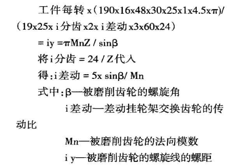 當磨削斜齒輪時,與用滾齒刀切削斜齒輪時一樣,必須調(diào)整差動掛輪架,掛輪架系根據(jù)從工作主軸到進給絲杠運動鏈的運動平衡方程式來進行調(diào)整: